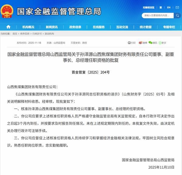 中国网财经11月20日讯日前,国家金融监督管理总局山西监管局公布相关批复,核准孙泽源山西焦煤(000983)集团财务有限责任公司(简称“山西焦煤集团财务公司”)董事、副董事长、总经理的任职资格。以下是相关批复正文: