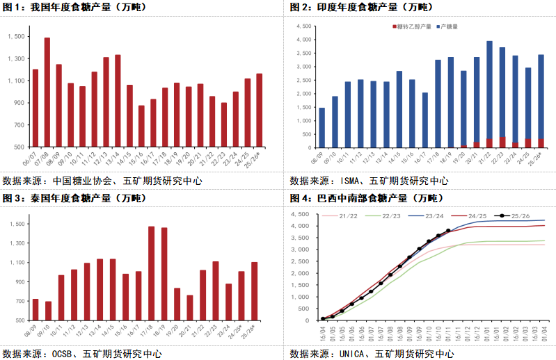 国内方面,据各主产区糖业协会预估,2025/26榨季广西甘蔗种植面积增加99万亩至1234万亩,入榨甘蔗量5400万吨,食糖产量预计为680万吨,同比增产30万吨;云南2025/26榨季糖产量预计为260万吨,同比增加18万吨;广东2025/26榨季食糖产量预计为60万吨,同比减少5万吨;内蒙古2025/26榨季食糖产量预计为70万吨,同比增加5万吨;新疆2025/26榨季食糖产量预计为76万吨,同比减少5.5万吨。结合全国各主产区情况来看,目前预估2025/26榨季全国食糖总产量为1160万吨,同比增加44万吨。