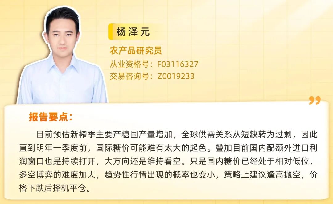 目前巴西2025/26榨季生产已到尾声,市场关注点转移至陆续开榨的北半球,主要跟踪中国、印度、泰国实际产量是否和预估值有较大的预期差,以及印度近期批准的150万吨食糖出口配额是否都能形成实际出口。总体而言,除非北半球主产国实际产量有较大幅度低于预估值的情况出现,否则短期内国际糖价向上空间承压。在此前提下,当前国内配额外进口利润窗口也是持续打开,大方向还是维持看空,只是价格已经在相对低位,多空博弈的难度增大,趋势性行情出现的概率也比较小,策略上建议逢高抛空,价格下跌后择机平仓。