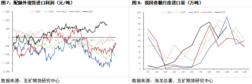 由于今年10月中旬海关开始对糖浆、预混粉进口管控进一步加强,管控范围从税则号170290项下,扩大到了税则号2106906项下。糖浆、预拌粉进口管控加严,叠加外盘价格持续下跌,使得国内配额外现货进口利润在11月初一度高达900元/吨以上。后续随着广西开启新榨季生产,以及我国10月食糖进口继续放量,短期供给增加,市场情绪转弱,郑糖短线连续下跌。但近期外盘价格开始止跌,内外价差有所收窄,同时郑糖价格也在相对低位,继续向下博弈的性价比俨然不高了。