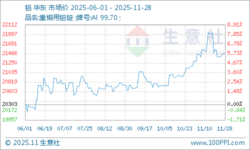 11月铝价先涨后跌。据生意社商品行情分析系统,截止2025年11月28日国内铝锭华东市场均价21460元/吨,较11月1日市场均价21293.33元/吨,上涨0.78%;较11月13日市场均价21933.33元/吨,下跌2.16%。