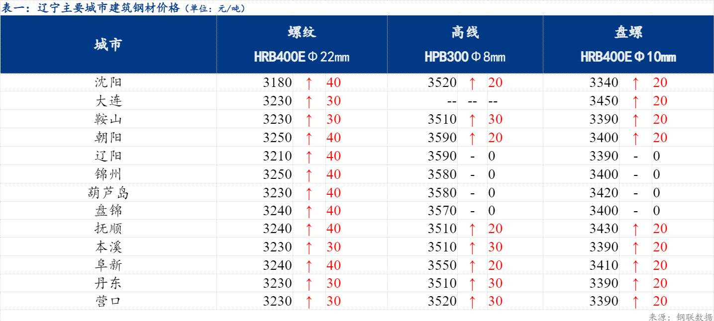 1、省内城市价格回顾:今日省内建筑钢材市场价格趋强,其中沈阳建筑钢材市场价格涨40元/吨,大连建筑钢材市场价格涨30元/吨 ,部分城市如朝阳和辽阳等市场拉涨30-40元/吨。