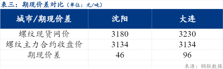 今日省内沈阳市场螺纹钢现货高于期螺主力合约价格46元/吨,环比昨日30元/吨的价差今日贴水缩小了7元/吨,大连螺纹钢现货高于期螺主力合约价格96元/吨,环比昨日96元/吨的价差今日贴水缩小了90元/吨,主要是期螺主力价格上浮36元/吨。