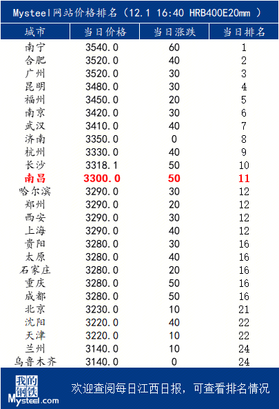 1日南昌螺纹钢(20mmHRB400E)排名较上一工作日排名上升4位,排名位列25个城市第11名,预计今日钢厂定价上涨。