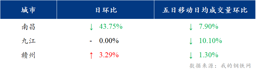 1日江西建筑钢材市场成交一般。其中南昌建筑钢材成交量较上个工作日下降43.75%,九江建筑钢材成交量较上个工作日持平,赣州建筑钢材成交量较上个工作日上升3.29%。