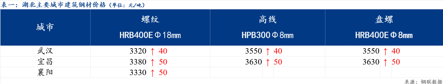 随着近期武汉地区建筑钢材价格快速上涨,目前湖北地区价格与周边价差继续扩大,外围资源预计到货量将进一步加大。而省内钢厂供应减少后,现货库存量有限,螺纹钢出现中间规格单独加价的情况,货少价挺现象比较突出。当前钢厂产量有限,挺价情绪积极。需求端表现一般,但受成本推动,预计短期湖北地区建筑钢材价格仍呈偏强调整。