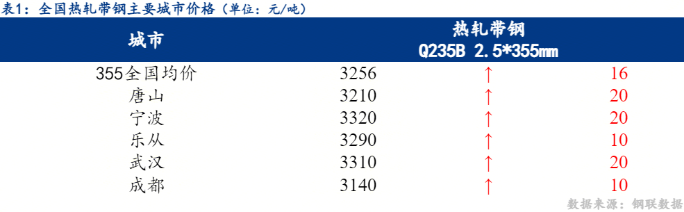 1日热轧带钢全国主要城市价格窄幅上调,截至发稿时2.5*355mm热轧带钢均价3256元/吨,较昨涨16元/吨,其中2.5*355mm主要城市报价为唐山3210元/吨,宁波3320元/吨,乐从3290元/吨。