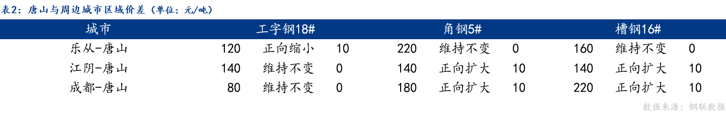 从区域价差来看,今日唐山与乐从工字钢价差正向缩小,与槽钢、角钢价差维持不变;唐山与江阴、成都工字钢价差维持不变,与角钢、槽钢价差正向扩大;
