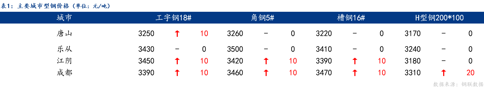 今日型钢价格稳中趋强运行,唐山工字钢价格较上一交易日上涨10元/吨,角钢、槽钢、H型钢价格较上一交易日持稳;乐从工字钢、角钢、槽钢、H型钢价格较上一交易日持稳;江阴、成都工字钢、角钢、槽钢价格较上一交易日持稳,江阴H型钢价格较上一交易日持稳,成都H型钢价格较上一交易日上涨20元/吨。