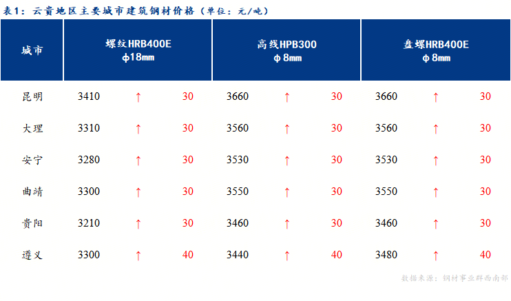 【今日价格】从云贵主要城市建筑钢材价格来看,昆明建筑钢材市场价格涨30元/吨,贵阳建筑钢材市场价格涨30元/吨。