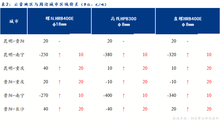 【区域价差】从区域价差来看,昆明与南宁价差扩大10元/吨,与重庆价差扩大20元/吨;贵阳与南宁价差扩大10元/吨,与重庆、长沙价差扩大20元/吨。
