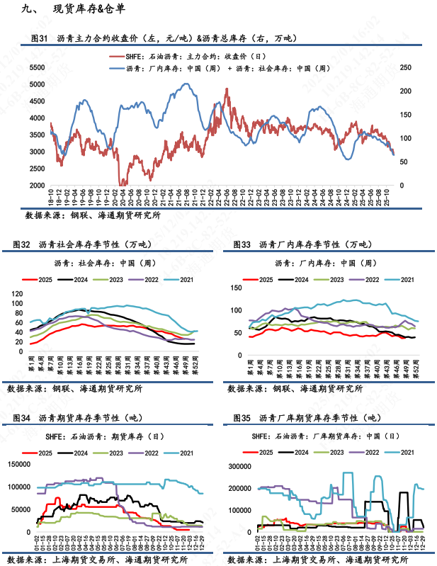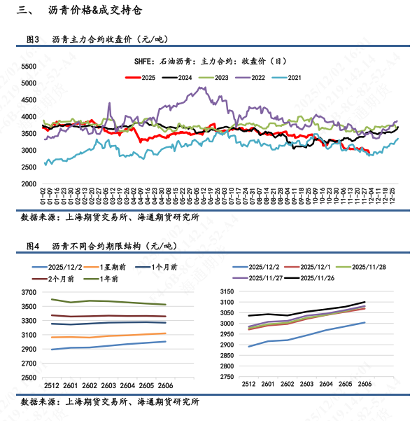 【5】短期展望:基本面上,价格依旧弱势看待,自身上行空间仍受制于需求减弱和库存压力两方面影响,关注冬储行情是否起色。年底前OPEC+增产冲击油价重心,沥青大概率跟跌重心下移。技术面上,沥青价格持续在磨底震荡,预期仍以低位徘徊为主。前期提供参考收盘价【3010-3100】,目前已跌穿区间,仍需耐心等待价格企稳信号。