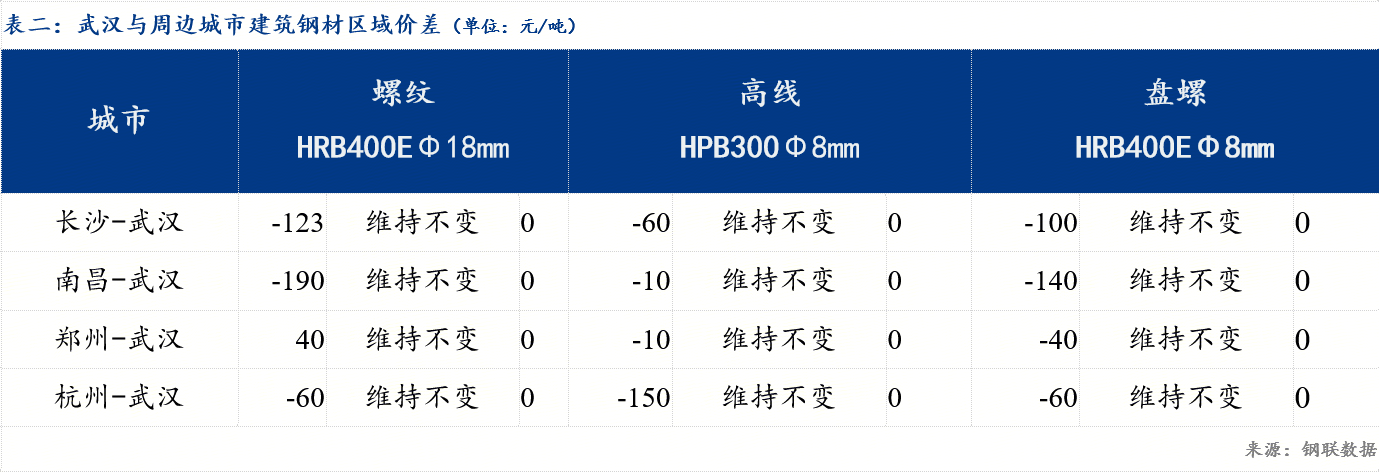 从品种价差对比看,武汉市场目前螺盘价差230元/吨左右,价格基本保持不变。从区域价差对比看,日内武汉市场螺纹钢网价较长沙市场价格高123元/吨,较南昌市场高190元/吨,较郑州市场低40元/吨,较杭州市场价格高60元/吨,今日全国螺纹钢均价跌2元/吨。