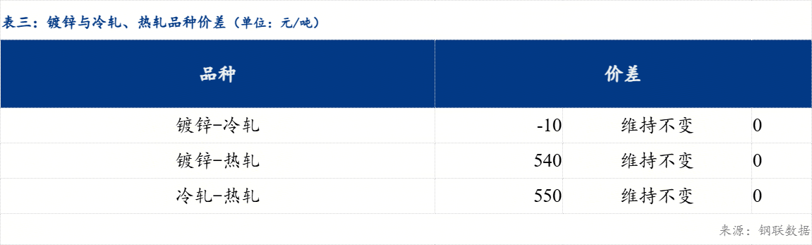 重庆、上海地区冷轧板卷区域价差维持不变0元/吨;重庆、广州冷轧板卷区域价差正向扩大10元/吨。重庆、上海镀锌板卷区域价差维持不变0元/吨;重庆、广州镀锌板卷区域价差维持不变0元/吨。镀锌、冷轧品种价差维持不变0元/吨;镀锌、热轧品种价差维持不变0元/吨;冷轧、热轧品种价差维持不变0元/吨。