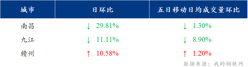 3日江西建筑钢材市场成交表现较差。其中南昌建筑钢材成交量较上个工作日下降29.81%,九江建筑钢材成交量较上个工作日下降11.11%,赣州建筑钢材成交量较上个工作日上升10.58%。