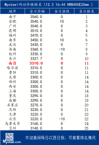 3日南昌螺纹钢(20mmHRB400E)排名较上一工作日排名持平,排名位列25个城市第11名,预计今日钢厂定价变化不大。