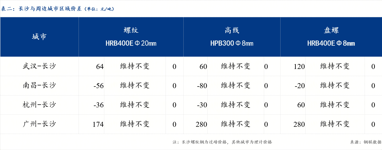 统一为理计单位后,武汉高于长沙64元/吨,价差扩大10元/吨;南昌低于长沙56元/吨,价差不变;杭州低于长沙36元/吨,价差扩大10元/吨;广州高于长沙184元/吨,价差不变。今日全国建筑钢材市场价格小幅上涨,湖南与周边市场区域价差变化不大。