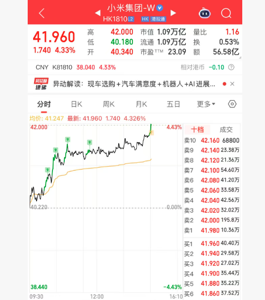 上证报中国证券网讯(记者李五强)12月4日,小米集团-W午后继续走强,截至15时01分,报41.96港元/股,涨4.33%,成交额超56亿港元。