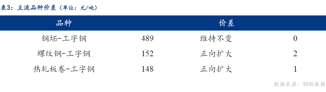 从品种价差来看,今日工字钢与钢坯价差维持不变,工字钢与螺纹钢,热轧板卷价差正向扩大。