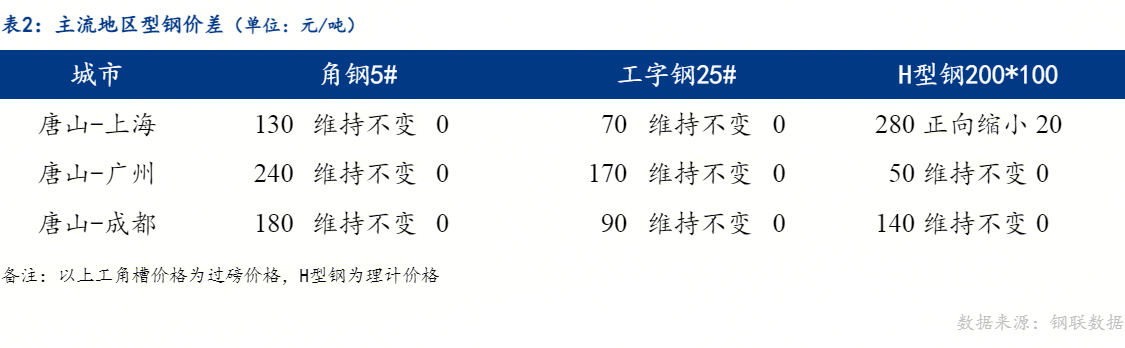 从区域价差来看,今日唐山与上海角钢、工字钢价差维持不变,H型钢价格正向缩小,唐山与广州角钢、工字钢、H型钢价差维持不变,唐山与成都角钢、工字钢、H型钢价差维持不变。