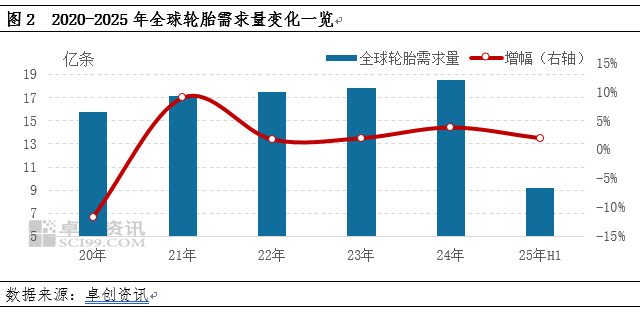 近几年全球轮胎需求量保持温和增长趋势,2025年上半年全球轮胎需求量约9.18亿条,较去年同期增长2%。2020年后全球轮胎市场发生了深刻变化,疫情后海运拥堵和供应链不确定性放大了市场需求的波动性,芯片短缺直接制约汽车生产影响原配市场需求下滑。但是中国轮胎企业凭借成本控制能力、快速的产品迭代以及渠道灵活性,在替换市场表现出较强的韧性;同时美国、欧盟、印度等国家和地区持续对来自中国的轮胎征收“双反”关税,以中策、赛轮、玲珑、森麒麟(002984)等为代表的头部企业,大力扩张海外基地(如东南亚、东欧),在全球市场份额持续提升,中国轮胎行业进入全球化运营的新阶段。而国际轮胎厂一方面受制于高昂的本土制造成本,另一方面在主流市场中面临中国品牌的激烈竞争,导致其市场份额出现下滑,利润承压。2025年,全球轮胎市场保持缓慢增长态势,主要是基于庞大的汽车保有量基础以及新能源汽车的发展支撑。但区域市场延续分化表现,其中中国轮胎市场产销量保持稳健态势;但欧洲、北美市场需求在关税政策预期扰动下,经销商提前囤货导致库存过高抑制当地轮胎生产放缓,然由于建筑、农业以及物流缓慢增长,欧美轮胎市场销售依旧疲软。