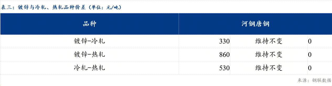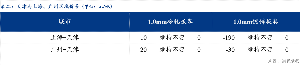 区域价差来看,上海-天津、广州-天津镀锌板卷价差均维持不变,现上海-天津、广州-天津镀锌板卷价差分别为-190元/吨和-30元/吨。品种价差来看,天津镀冷、天津镀热价差均维持不变,现天津镀冷、天津镀热价差分别为330元/吨和860元/吨。