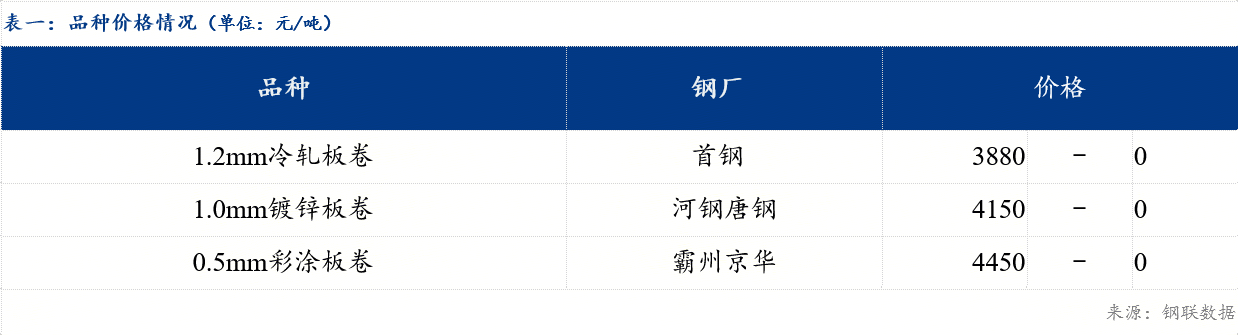 今日天津市场价格整体持稳,现冷轧板卷报3880元/吨、镀锌板卷报4150元/吨、彩涂板卷报4450元/吨。市场方面,今日热卷期货震荡偏强运行,涂镀市场商家报价持稳,但成交多处于观望状态,多为询单电话,实际成交表现一般,多为低价民营资源为主。