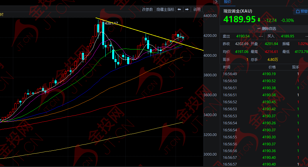 隔夜,现货黄金大多数时间稳定在4200上方,疲软的美国就业数据一度帮助金价盘中触及4241.40美元的高点,但尾盘回吐涨幅,收报4203美元附近,接近收平。今日欧市盘中,黄金小幅下跌,目前在4188美元附近徘徊。