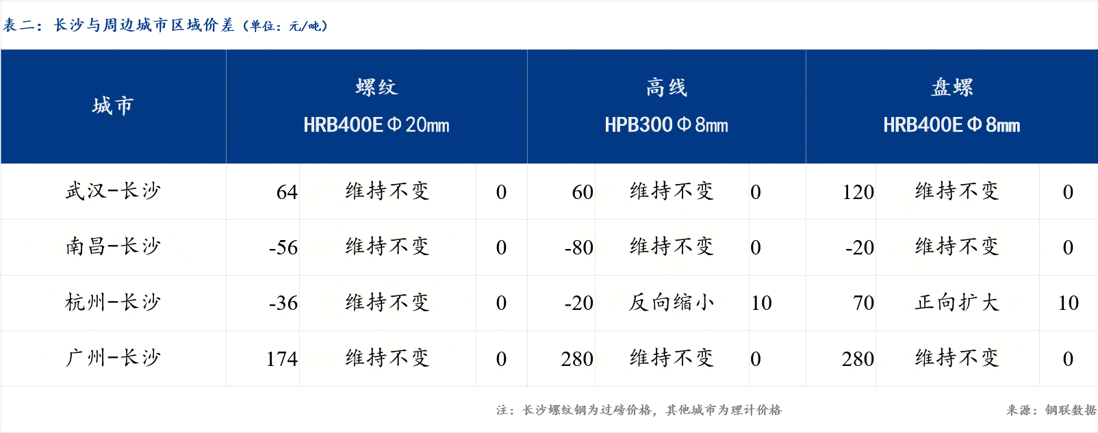 统一为理计单位后,武汉高于长沙64元/吨,价差不变;南昌低于长沙56元/吨,价差不变;杭州低于长沙36元/吨,价差不变;广州高于长沙184元/吨,价差不变。今日全国建筑钢材市场价格涨跌互现,湖南与周边市场区域价差变化不大。