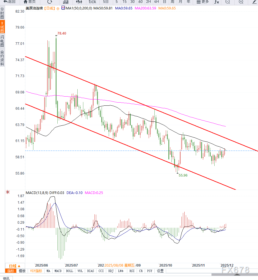 从日线级别观察,美原油正在从弱势整理向强势反弹结构切换。近期价格在58美元附近构筑明显底部后持续回升,并成功突破短期均线粘合区,显示买盘力量逐步增强。