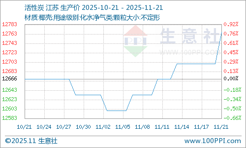 据生意社商品行情分析系统监测:周初活性炭价格为12833元/吨,周末活性炭价格为12866/吨,价格上涨0.26%。