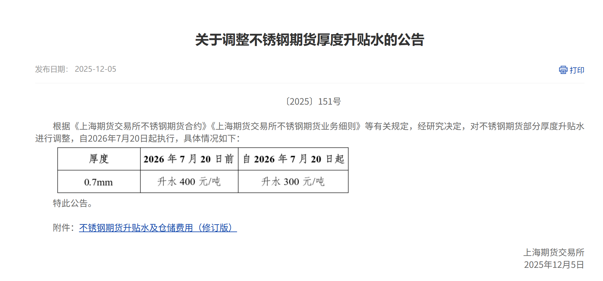 人民财讯12月5日电,上海期货交易所发布公告称,根据《上海期货交易所不锈钢期货合约》《上海期货交易所不锈钢期货业务细则》等有关规定,经研究决定,对不锈钢期货部分厚度升贴水进行调整,自2026年7月20日起执行。