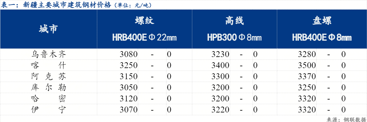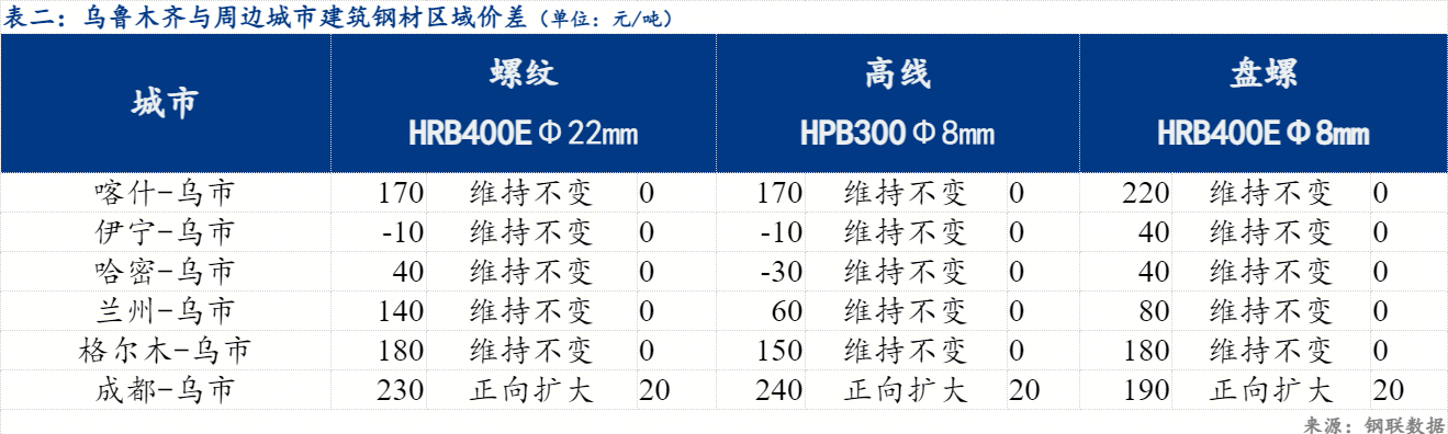 4、本地价格选取钢厂:乌鲁木齐(八钢)、喀什(八钢)、阿克苏(八钢)、库尔勒(八钢)、伊宁(八钢)、哈密(八钢)、兰州(酒钢),格尔木(酒钢),成都(达钢)。