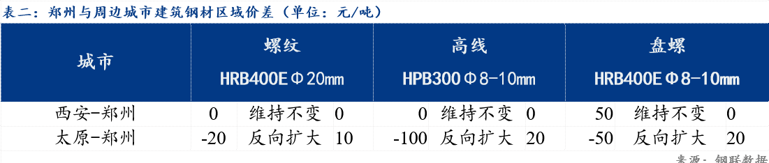 从区域价差情况来看,目前西安螺纹钢价格与郑州持平,太原螺纹钢价格较郑州价格低20元/吨;西安高线价格与郑州持平,太原高线价格较郑州价格低100元/吨;西安盘螺价格较郑州高50元/吨,太原盘螺价格比郑州低50元/吨。