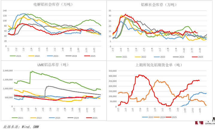 进入2025年12月份,电解铝运行产能预计环比小幅增加,部分新建电解铝项目预计2025年底至2026年初起槽通电,需关注相关投产进度。铝 水比例方面,据市场反馈,下游需求边际转弱,企业铸锭预期增强;但据悉12月部分利废企业因废铝采购困难或采购价格过高,而选择更多 采购铝水,铝水比例逆趋势提升;个别铝厂周边配套加工厂产能投产放量,铝水比例预计提升。综合来看,铝水比例预计下降0.7个百分点至 76.6%。后续需关注原铝替代废铝的相关情况,以及下游加工厂开工率变动。