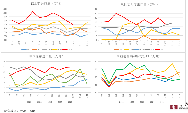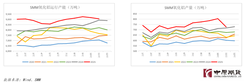 12月氧化铝市场预计延续供应过剩格局。随着月均价持续下行,晋豫地区部分高成本企业陷入亏损,经营压力不断加剧。供应端方面,11月 海外氧化铝呈现净进口态势,持续对国内市场形成冲击,预计12月进口规模将维持上月水平,进一步压制国内氧化铝市场。在此背景下,部 分企业可能通过主动减产或安排检修以应对压力。整体来看,预计12月行业运行产能将维持在8869万吨左右。