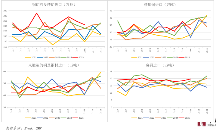 进入12月,据SMM与市场交流得到有4家冶炼厂检修,涉及粗炼产能75万吨,精炼产能75万吨,预计检修影响量为0.5万吨。原计划11月减产的 某冶炼厂因硫酸收益高以及存出口需求,检修再度延迟,12月检修影响量预计在1月显现。 SMM预计12月电解铜产量环比增加6.57万吨,增幅 5.96%,同比增幅6.69%。1-12月累计产量增加136.27万吨,累计同比增幅11.30%。12月因部分冶炼厂统计周期延长以及前期检修影响量基本全 部回归,本月产量再次冲高。