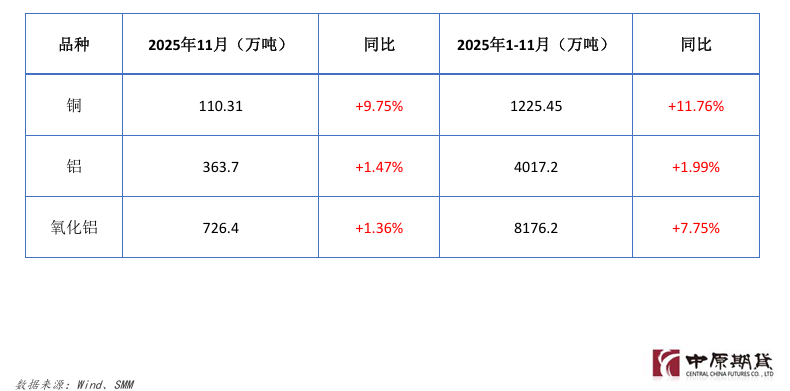 据SMM统计,2025年11月海外电解铝总产量同比增长2.1%;月度平均开工率为88.8%,环比下降0.3个百分点,同比小幅提高0.5个百分点。截 至11月末,2025年累计产量已同比上涨2.8%。10月21日,Century Aluminum Company 10月21日发布公告,其全资子公司NorA°urAil Grundartangi ehf因电气设备故障,已暂时停止了位于冰岛Grundartangi铝冶炼厂两条电解槽生产线中的一条,冶炼厂的第二条电解槽生产 线未受影响,继续满负荷运行,此次停产使该冶炼厂的产量减少了约三分之二,事故发生期间未造成人员伤亡。11月6日,Century Aluminum Company三季度业绩会上表示,该生产线停产预计造成四季度出货量降低3.7万吨;产线的重启取决于用于更换的电力变压器的制造、运输和 安装速度,预计这一工作需要11-12个月完成。印尼电解铝项目PT Kalimantan Aluminium Industry 一期50万吨产能已于11月底开始起槽投 产,预计将于2026年10月实现一期满产。