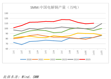 11月SMM中国电解铜产量环比增加1.15万吨,环比增幅1.05%,同比增幅9.75%。1-11月累计产量同比增加128.94万吨,增幅为11.76%。 11月产 量略高于预期,本月粗铜相对宽裕,部分冶炼厂检修影响量低于预期。11月检修影响量实际值为4.22万吨,较预期值4.8万吨少0.58万吨。