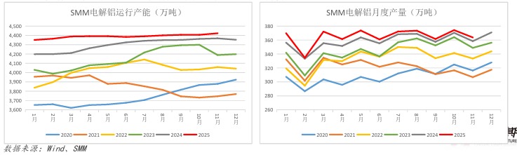 截止11月份底,SMM统计国内电解铝建成产能约为4612万吨左右,国内电解铝运行产能约为4422.5万吨左右。据SMM统计,2025年11月份(30 天)国内电解铝产量同比增长1.47%,环比减少2.82%。11月开始电解铝逐步由消费旺季向消费淡季过渡,下游开工率出现下降趋势,铝水比 例降低,行业铝水比例下降0.5个百分点至77.3%,下降幅度低于月初预期,主因:1)部分铝厂周边配套加工厂产能进一步提升,铝水比例提 升;2)11月下半月,铝价自高位回落,铝棒加工费走强,铝棒厂生产意愿较好。根据SMM铝水比例数据测算,11月份国内电解铝铸锭量同比 减少13.4%,环比增加减少0.78%至82.8万吨附近。