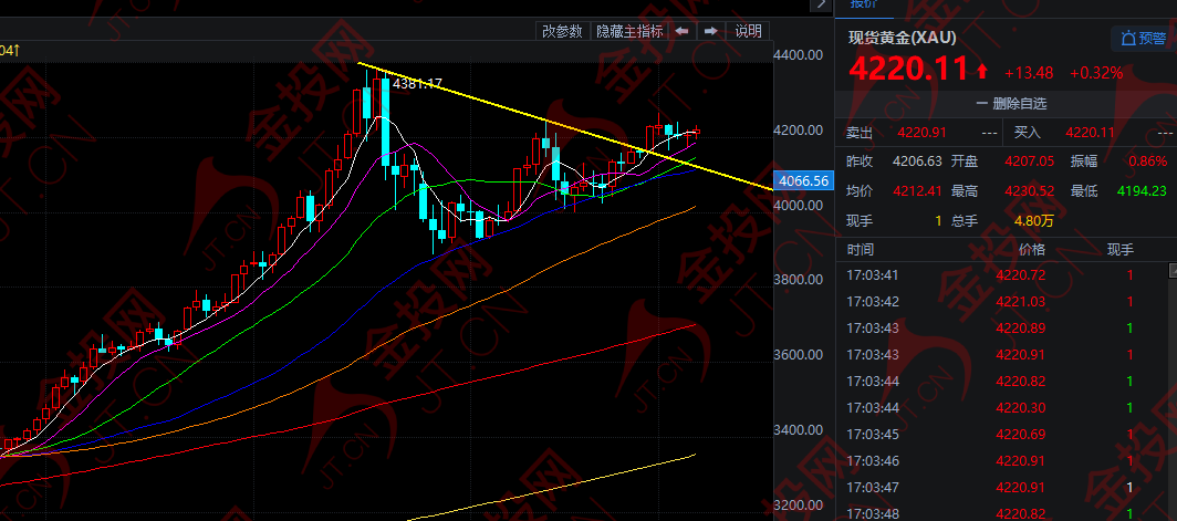 隔夜,现货黄金震荡微涨0.13%,盘中一度下探至4175美元附近,但随后反弹至4219美元高点,表明买盘力量依然活跃,最终收报4208.60美元。今日欧市盘中,黄金小幅上涨,目前在4218美元附近徘徊。