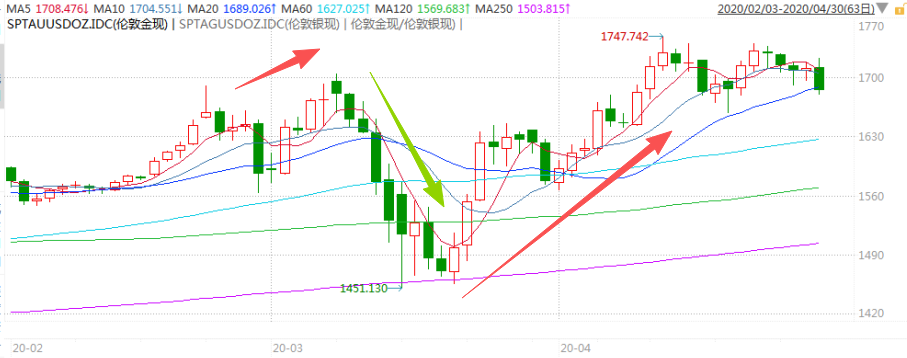 2020年新冠疫情爆发初期(2020年2月下旬至3月初),随着疫情在欧洲快速蔓延,全球风险情绪急剧恶化。标普500指数单周暴跌11.5%,创2008年以来最大跌幅;道琼斯工业指数出现30年来首次熔断;VIX恐慌指数一度突破40。与2008年9月金融危机初期相似,黄金作为传统避险资产价格逆势上行,从1544美元/盎司升至1692美元/盎司,涨幅近10%。
