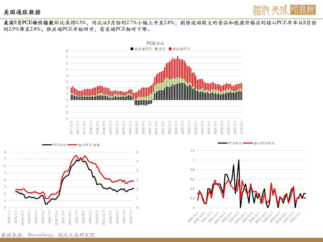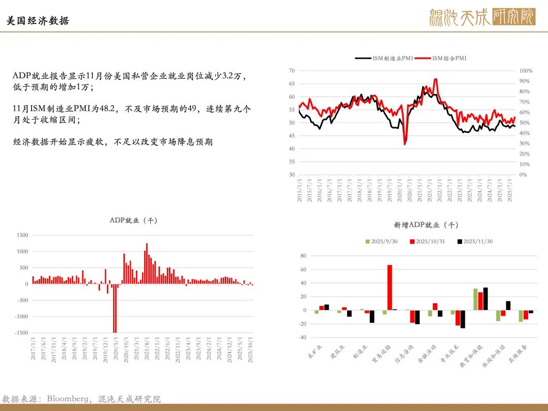 数据不足以改变美联储降息预期:11月份美国ADP就业减少3.2万,低于预期的增加1万;11月ISM制造业PMI为48.2,不及市场预期的49,连续第九个月处于收缩区间;美国9月PCE物价指数环比录得0.3%,同比从8月份的2.7%小幅上升至2.8%;剔除波动较大的食品和能源价格后的核心PCE年率从8月份的2.9%降至2.8%;供应端PCE开始回升,需求端PCE相对下降;经济数据开始显示疲软,通胀数据不足以改变市场降息预期。