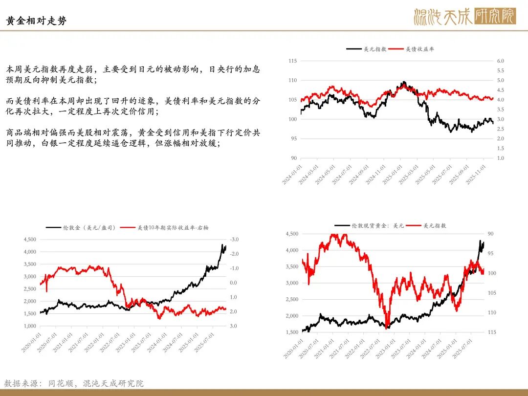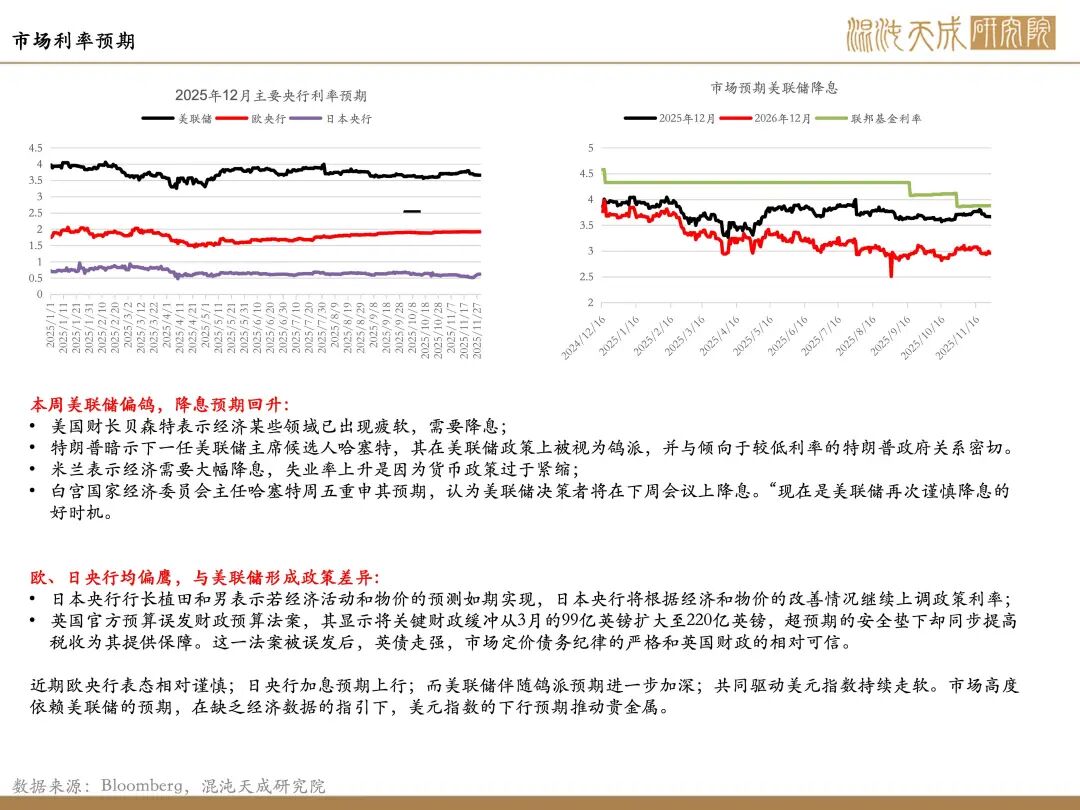 美元指数持续走弱:美国财长贝森特表示经济某些领域已出现疲软,需要降息;特朗普暗示下一任美联储主席候选人哈塞特,其在美联储政策上被视为鸽派,并与倾向于较低利率的特朗普政府关系密切;哈塞特周五表示降息现在是美联储再次谨慎降息的好时机。日本央行行长植田和男表示若经济活动和物价的预测如期实现,日本央行将根据经济和物价的改善情况继续上调政策利率;近期欧央行表态相对谨慎,日央行加息预期上行;而美联储伴随鸽派预期进一步加深,共同驱动美元指数持续走软。