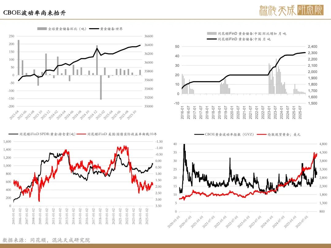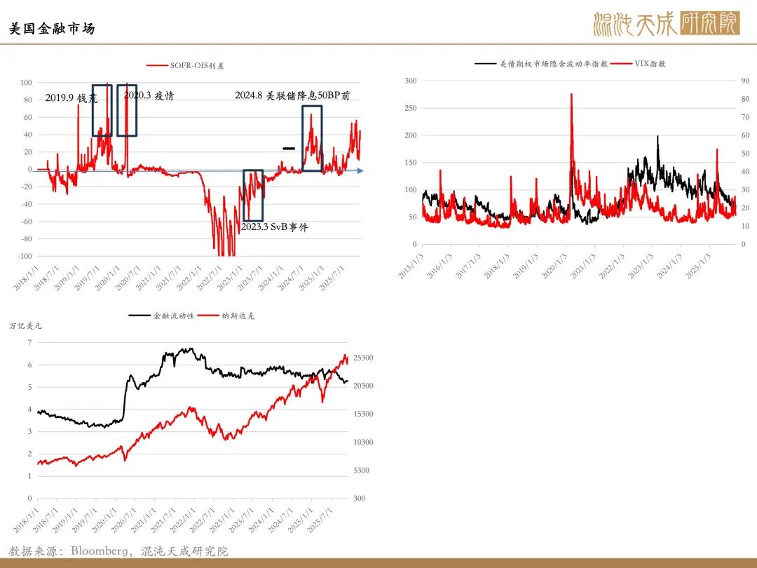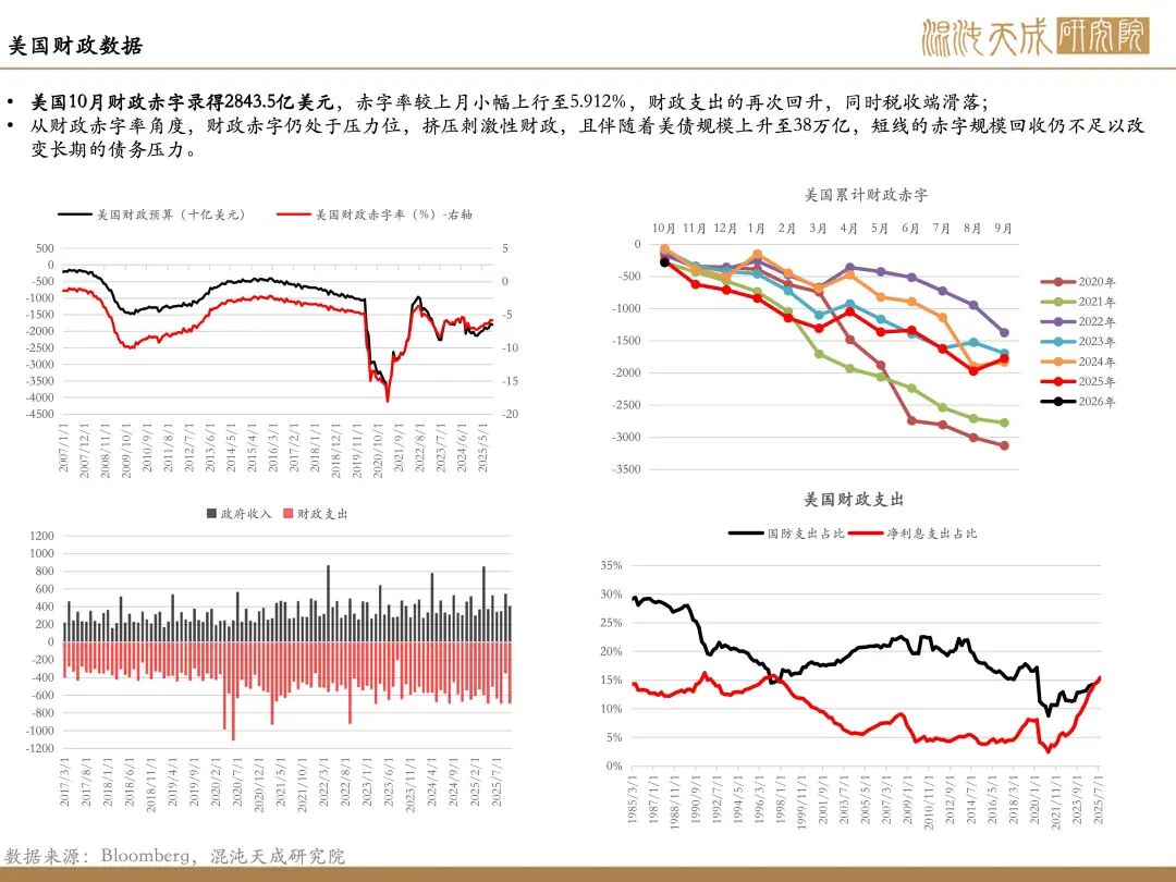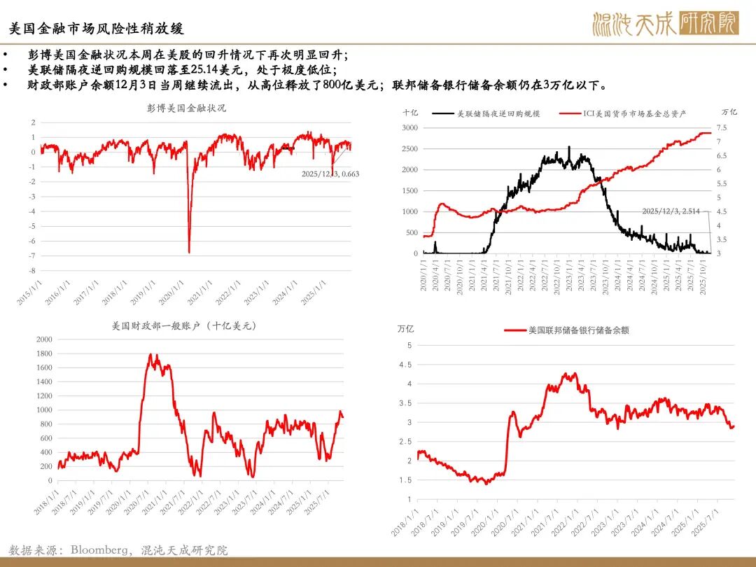 金融流动性风险仍存:政府重启后TGA账户持续释放流动性,11月开始大约释放了800亿美元;本周主要的流动性计价来自于美股的回升,从而缓解市场压力;但是英伟达和比特币行情的放缓对于市场而言存在风险上行的可能性。总体而言,接下来流动性的观察仍以TGA账户资金释放和美股走势作为关键因素,底层资产不出现明显风险的情况下,短线流动性风险会缓解。美债利率在本周出现走高,美国财政部本周两次下场买债释放流动性,下周的十年期美债拍卖值得关注,如若美债利率持续高位对市场而言仍具备抑制。