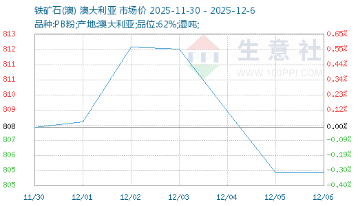 据生意社商品行情分析系统显示,本周(11.30-12.6,下同)铁矿价格震荡上行,趋强运行。截至6日,生意社铁矿价格指数为811,环比上行0.45%,具体如上图。本周铁矿价格震荡上行、趋强运行,其主要原因是本周当前黑色市场核心矛盾转向供给压力与弱需求的双重压制。铁水产量下降印证终端需求疲软,港口铁矿库存被动累积至1.6亿吨高位,凸显现实供需错配。同时,西芒杜项目发运与VALE增产目标强化了中长期供应宽松预期。在宏观面无强力政策刺激的背景下,市场缺乏上行驱动,所以本周铁矿延续弱需求主导的弱势格局,价格易跌难涨。