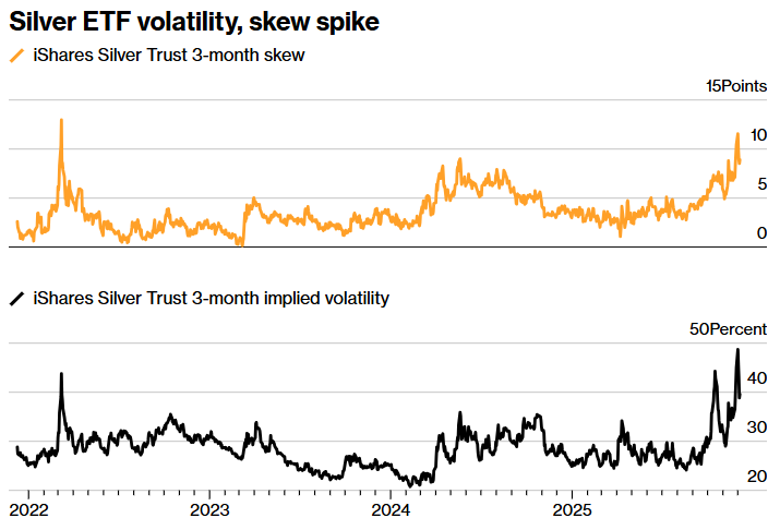 在追踪白银这一金属的规模最大的ETF——iShares Silver Trust中,隐含期权波动率上周升至自 2021 年初以来的最高水平。当时,白银曾短暂吸引了meme股投资者的关注。过去一周,该基金吸引了近 10 亿美元的资金流入,超过了最大的黄金基金的流入量,进一步支撑了现货价格。