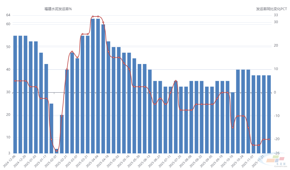 就水泥大数据信息显示,福建地区库容比为75%,较上年同比增长17.5个百分点,库存压力较大;发运率为37.5%,较上年同比下降20个百分点,下游需求端未见明显起色。