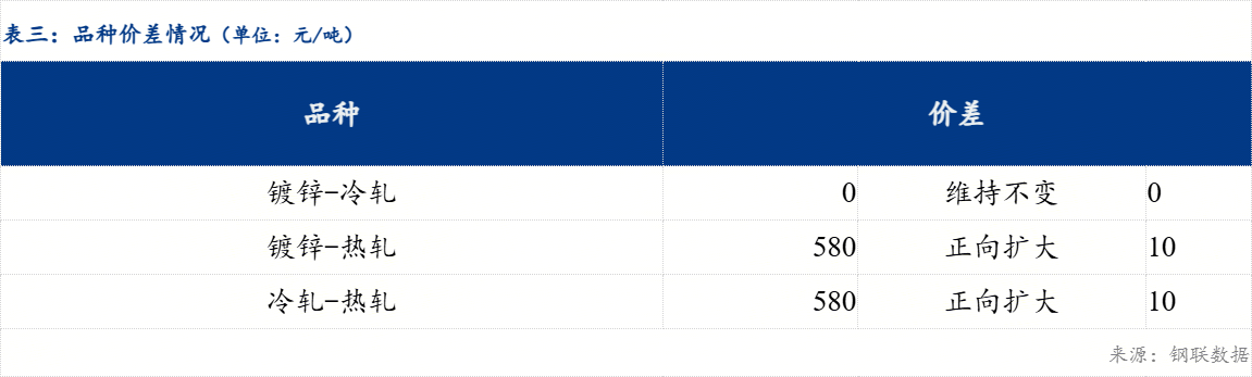 品种价差来看,现镀冷价差为0元/吨,较上一交易日维持不变;镀热价差为580元/吨,较上一交易日正向扩大10元/吨;冷热价差为580元/吨,较上一交易日正向扩大10元/吨。