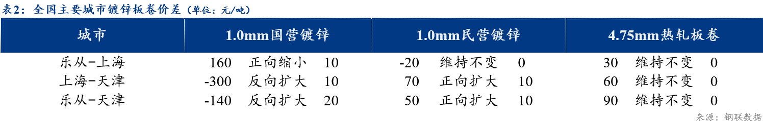 【区域价差】国营资源:乐从-上海价差为160元/吨,上海-天津价差为-300元/吨,乐从-天津价差为-140元/吨。民营资源:乐从-上海价差为-20元/吨,上海-天津价差为70元/吨,乐从-天津价差为50元/吨。